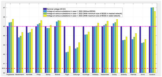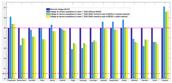In the case of 2022, a BESS has been integrated into two network topologies: one is the present operating scenario—i.e., the radial network—and the other is a meshed network by considering the upper islanded network supplied by Senneby. Figure 11 shows the radial network topology with the total predicted increase in load demand of 21.2 MW with reference to the present-day load demand, and this has been distributed at Mariehamn, Svinö, and Föglö substations. In this network topology, the appropriate size of the BESS was found to be of 5 MVA each, and the strategic locations were at Mariehamn, Norrböle and Föglö substations. Figure 12 illustrates the meshed network topology with the same increase in load demand of 21.2 MW, distributed at Mariehamn, Svinö, and Föglö substations. In this network topology, the suitable size of the BESS was found to be 2.5 MVA each, and the strategic locations were at Mariehamn, Norrböle, and Föglö substations. Figure 13 shows the nominal voltage profiles of 45 kV substations’ operating voltages without BESSs and with BESSs in radial and meshed network topologies. It has been verified that the voltage profiles have slightly improved with the integration of BESS, and they are within the limits of ±10%.