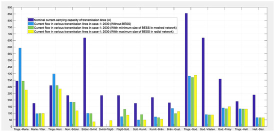 In the case of 2030, BESSs have also been located in two network topologies: one is the practical operating scenario—i.e., the radial network—and the other is a meshed network by considering the upper islanded network being supplied. Moreover, two islanded networks supplied from Senneby and Gustavs have also been meshed in order to reduce the size of the BESS. Figure 15 shows the radial network topology with the total predicted increase in load demand of 48.7 MW with reference to the existing load demand, and this has been distributed at Mariehamn, Svinö, Föglö, Finby, Brändo, and Kumlinge substations. In this network topology, the appropriate size and location of the BESS was determined to be as follows: 20 MVA at Mariehamn substation, 7.5 MVA at Norrböle substation, and 5 MVA at Föglö substation. Figure 16 illustrates the meshed network topology with the same increase in load demand of 48.7 MW, distributed at the above-mentioned substations. In this network topology, the suitable size and location of the BESSs was found to be 10 MVA each at Mariehamn and Norrböle substations, and 5 MVA at Föglö substation. Figure 17 shows the nominal voltage profiles of 45 kV substations and operating voltages without BESSs and with BESSs in radial and meshed network topologies. The simulation results show that the voltage profiles have somewhat improved with the integration of BESSs, and they are within the limits of ±10%. Figure 18 presents the nominal current-carrying capacity of transmission lines and the operational currents of transmission lines without BESSs and with BESSs in radial and meshed network topologies. The results verify that all the transmission lines are now within their nominal current-carrying capacity and none of the power transmission lines are overloaded.