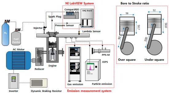 The bore to stroke (B/S) ratio is a factor that should be considered early in the design stage of the engine. As the bore/stroke ratio decreases under the same displacement conditions, the cylinder surface/volume ratio at top dead center (TDC) also decreases, which increases engine efficiency due to the cooling reduction effect [5]. Like this, the B/S ratio is an important factor that directly affects engine efficiency. For this reason, various studies based on the B/S ratio have been previously conducted [6,7]. Most of the studies have been interpreted to compare the turbulence intensity, flame surface and thermal efficiency in the cylinder according to the B/S ratio. Experimental studies based on B/S ratios were often conducted. [8,9]. However, in the case of engine research based on most B/S ratios, the torque and engine power comparison is a study. On the other hand, in this study, the combustion pressure was measured to calculate the combustion rate in the combustion chamber and the engine loss compared to the abnormal cycle. In addition, gas and particle emission were also analyzed. In addition, gasoline engines utilizing increased compression ratio and output along with increasing the fuel octane number to overcome the disadvantages of fuel economy have been applied. In this respect, many studies are being conducted using ethanol, an oxygen fuel, which is harmless to the human body and is less burdened by environmental pollution. By lowering the fuel temperature, the volumetric efficiency can be improved, and as result, a mixture of gasoline and ethanol improves the engine performance [10,11,12].