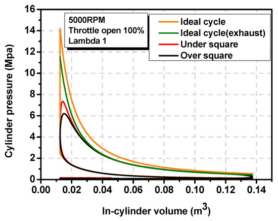The P–V diagram for over- and under-square engines compared to the ideal cycle.