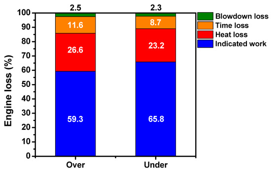 Figure 5 shows the pressure and volume (P–V) diagram for the B/S ratio and three different losses and indicated mean effective pressure (IMEP) compared to the ideal cycle. In general, it is judged that the loss of the engine is consumed in the range (energy conversation efficiency). In the case of IMEP, the result was about 50% including the pump loss. In addition, other studies have shown that the IMEP results are around 35–40% [7]. The IMEP results of this study show a result between 60% and 70%, which was considered to have a high result because it did not include exhaust heat loss. In addition, the result of heat loss might be somewhat inaccurate because it was measured based on the pressure data, but the tendency of the loss result was reasonable and judged. From the minimal heat loss to combustion time loss and exhaust blowdown loss, the relative values for each loss are shown in Figure 6. Heat losses via the cylinder wall during the second half of the compression stroke (during the combustion duration) and during the expansion stroke were 26.6% and 23.2%, followed by combustion losses of 11.6% and 8.7%, and finally, blowdown losses of 2.5% and 2.3%, respectively. The most significant factors in the heat losses observed were the flame propagation and combustion time mentioned above. Differences in flame propagation due to engine shape also affect heat transfer. In particular, when the bore and stroke size were changed, the timing and the contact area of the flame and the contact between the piston and the cylinder wall change—both of which affect heat transfer. In the case of long stroke engines, they have a relatively narrow bore and the piston is far from the spark plug, so that the flame surface first contacts the cylinder wall before contacting the piston. In short stroke engines, on the other hand, the flame first contacts the piston before the cylinder wall. This causes greater heat transfer to the piston tower. In the case of the cylinder wall, constant temperature control is possible through the coolant, but in the case of the piston tower, since no additional temperature control is performed, more heat transfer occurs and a large heat loss occurs. Next, in the case of the loss of combustion time, the burning time due to the flame propagation and turbulence intensity in the long stroke, under-square engine was reduced and the loss corresponding to this duration was reduced. Finally, the 2.5% blowdown losses were similar between models.