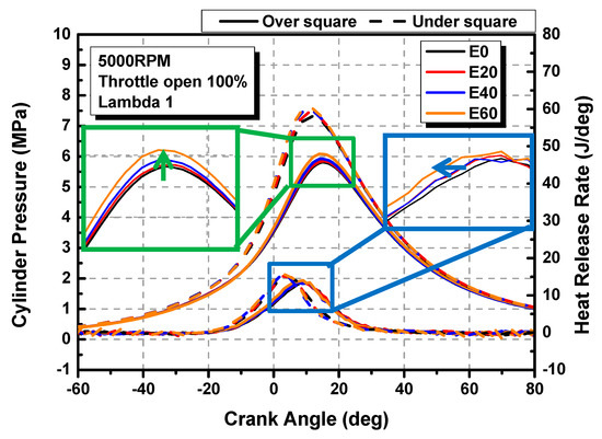 In-cylinder pressure and heat release rate for over- and under-square engine vs. ethanol blending ratio.