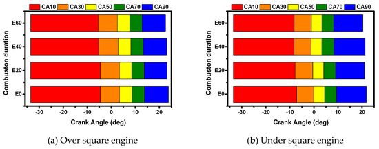 Figure 7 shows the results of cylinder pressure and heat release according to ethanol content. According to the B/S ratio, combustion characteristics of 20% intervals from 0% to 60% of ethanol were compared. As can be seen from the results, as the ethanol blending ratio increased, the combustion pressure increased and the combustion duration shortened. This is because ethanol had higher oxygen content than gasoline, which results in more active combustion. Therefore, the combustion pressure was gradually increased and the initial combustion speed was fast. Figure 8 and Table 5 show the combustion duration results from CA10 to CA90 for over-square and under-square engines. As can be seen in Table 5, the difference between the combustion speeds of the over and under square engines was largely about 4 degrees in CA 50, and the difference in combustion speed was about 2 degrees on average. This result seems to be due to the difference in the flame surface mentioned above. Both engines also have shorter combustion duration as ethanol blending rate increases. This is because the laminar flame propagation speed of ethanol is faster than that of gasoline. Noteworthy is that the flame propagation speed in the combustion chamber was not significantly affected by the turbulent flame propagation speed, but more so by the laminar flame propagation speed.