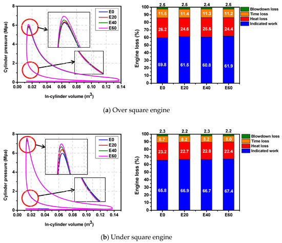 The P–V diagram and three engine losses for over and under square engines and ethanol blending ratio.