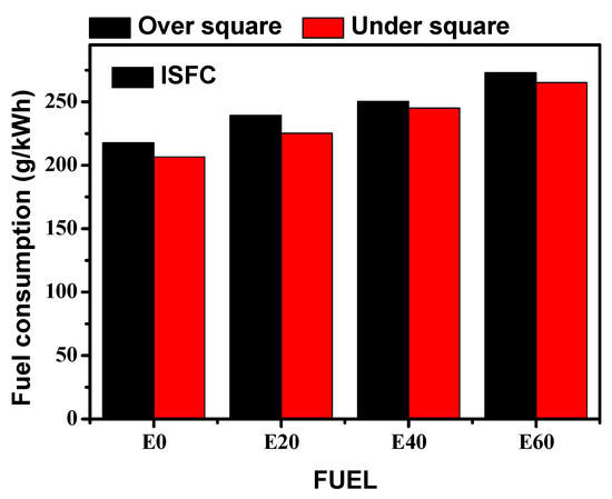 Fuel consumption for over- and under-square engine and ethanol blending ratio.