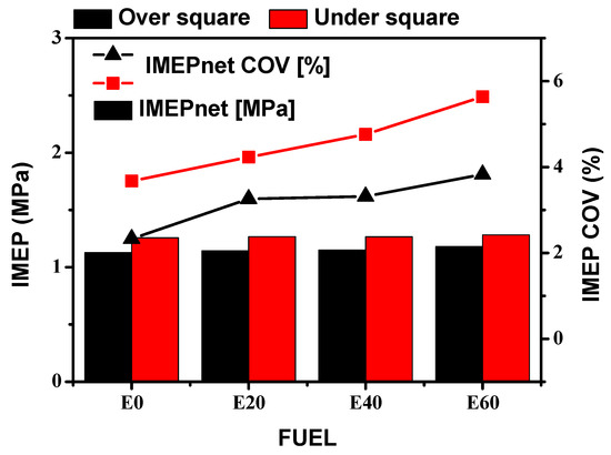 Figure 9 shows the P–V diagram according to ethanol content and shows the calculated losses under each condition. As the content of ethanol increased, the net loss of time indicated by the change of combustion time increased, and the net indicated work could be relatively increased. However, the results upon varying the ethanol content did not show much difference. As can be seen from these results, when ethanol was mixed with gasoline, the combustion characteristics of the engine were not significantly affected. However, ethanol fuel had a lower low calorific value than gasoline, so the difference in fuel consumption was large. Figure 10 shows the results of fuel consumption compared to the same output according to B/S ratio and ethanol content. Figure 11 shows the results of IMEP under each condition. First, the fuel consumption and IMEP results according to the B/S ratio could be confirmed by the high IMEP resulting in the relatively low-loss in under-square engines. As a result of increasing ethanol content, the IMEP also increased in both over-square and under-square engines. As shown in the combustion chamber internal pressure results and loss results, it was determined that the combustion speed was also increased. In the case of fuel consumption, the amount of fuel injected was increased due to the low heat value of ethanol.