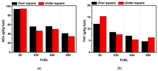 (a) NOx and (b) THC emissions for over- and under-square engine vs. ethanol blending ratio.