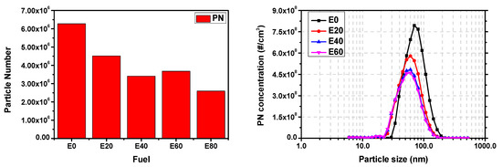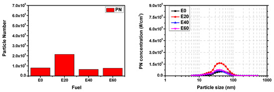 Finally, Figure 13 and Figure 14 compare the particle numbers (PN) with increasing ethanol blending ratio in over- and under-square engines. In the case of PN measured in PPS-M, the average value of PN measured for certain duration of time was shown, and in the case of emission concentration by particle size, the cumulative result was shown at the same time.