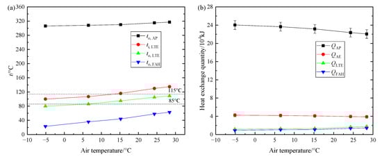 The flue gas temperature was set at 380 °C, the flue gas flow was 250 Nm3/h, and the bypass flue gas ratio was about 15% of the total flue gas flow. The experiment was carried out respectively when the air temperature was −5.1 °C, 6.5 °C, 15.2 °C, 24.3° C, and 28.4 °C. The relationship between the air temperature and performance parameters of FWCRS such as main node temperatures, heat exchange quantities of the exchangers, waste heat recovery efficiency, system exergy efficiency, and energy grade replacement coefficient are shown in Figure 8 with error bars.