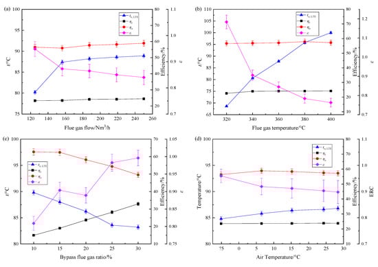 The flue gas flow was set at 250 Nm3/h, the initial air temperature was 27.1 °C, and the flue gas temperature was 380 °C. As the bypass flue gas ratio varied from 10% to 30% of the total flue gas flow, the relationship between the bypass flue gas ratio and the performance parameters of FWCRS are shown in Figure 7 with error bars.