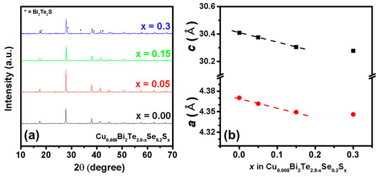 (a) XRD patterns and (b) lattice parameters a and c of Cu0.008Bi2Te2.8−xSe0.2Sx (x = 0, 0.05, 0.15, and 0.3).