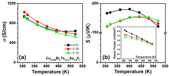 Figure 2a,b shows the σ and S values of the S-doped Cu0.008Bi2Te2.8−xSe0.2Sx (x = 0, 0.05, and 0.15) as functions of the temperature. The σ of the undoped sample was approximately 940 S/cm at 300 K, which slightly increased to 1020 S/cm for x = 0.05, and then decreased to 920 S/cm at x = 0.15. As shown in Figure 2b, the magnitude of the S at 300 K significantly decreased from 183 to ~160 μV/K by the doping. However, the undoped sample exhibited a decrease in the S at higher temperatures around 400 K, while the magnitudes of the S of the S-doped samples increased at temperatures higher than 440 K. At temperatures higher than 480 K, the magnitudes of the S of the S-doped samples were higher than those of the undoped sample. Thus, the power factor (S2σ) at 300 K (inset of Figure 2b) decreased with doping at all measurement temperatures.