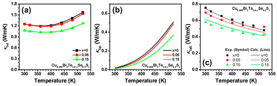 Figure 5a shows the κtot values of the measured samples as functions of the temperature. Despite the increase in the σ of the sample with x = 0.05, its κtot was unchanged. The κtot of the sample with x = 0.15 was smaller than those of the other samples. To understand the change in the thermal transport behavior by S doping, we separated the electronic (electronic thermal conductivity, κele), bipolar (κbp), and lattice contributions (κlatt) from κtot. The electronic thermal conductivity, κele, was estimated using the Wiedemann–Franz law. The calculations of κbp and κlatt are described in Sections S1 and S2 in the Supplementary Materials, respectively. Figure 5b presents the κbp calculated using the two-band model based on the fitted parameters listed in Table S1 and shows the reduction in κbp with S doping. A reduction in κbp was expected considering the decrease in A and the increase in the electron concentration in Figure 4a. Thus, the κbp was reduced by the S doping, which induced the bandgap widening shown in Figure 3a. The experimental κlatt (= κ − κele − κbp) values are shown as symbols in Figure 5c, which are well matched with the calculated theoretical κlatt (lines). The theoretical κlatt calculation is presented in Section S2 in the Supplementary Materials [18]. The experimental and theoretical κlatt values decreased with the doping, which implies an additional phonon scattering originated from the doped S. Owing to the effects of the mass and lattice constant differences between the two constituents of the alloy, a large additional contribution from phonon scattering was observed, owing to the large mass and ionic radius differences between S and Te/Se (atomic masses MTe = 127.60 u, MSe = 78.96 u, MS = 32.06 u, ionic radii rTe = 221 pm, rSe = 198 pm, and rS = 184 pm). Considering the rather large ΔM and Δa values, the additional phonon scattering was expected.