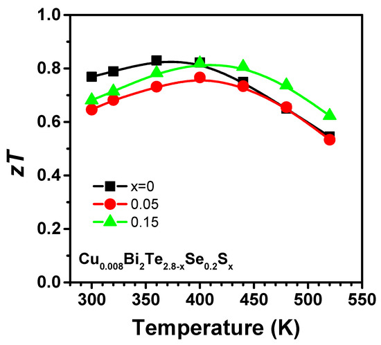 zT values of Cu0.008Bi2Te2.8-xSe0.2Sx (x = 0, 0.05, and 0.15) as functions of the temperature.