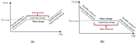 - The state of TES material: a distinction is made between sensible heat storage and latent heat storage. The sensible heat is the heat that determines a temperature change (increase or decrease) in a thermal storage material, without changing its chemical composition or phase. The latent heat is the heat that determines the phase change (the transition from solid to liquid or from liquid to vapour) in a thermal storage material without modifying the storage material temperature (Figure 1). A phase change takes place in a thermal storage material during heat exchange without variation in the material chemical structure. During the phase change, the heat could be absorbed (in the melting process) or released (in the freezing process).