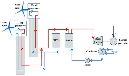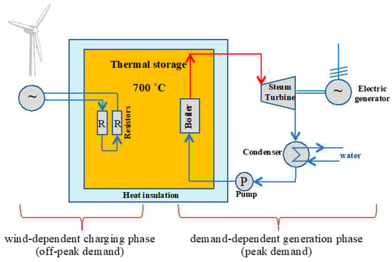 Furthermore, the VRES location depends on the RES availability and does not generally match with the location of the load centres [62]. Moreover, a VRES requires energy storage to fit seasonal and everyday changes and to assure the continuous operation in various systems [21]. The VRES is used almost continuously to mitigate the fluctuations in output from the VRES. A thermo-electric energy storage (TEES), whose scheme is sketched in Figure 3 [63], can be used to take excess electricity during off-peak demand periods, convert it into heat, and store heat to be used in a secondary thermodynamic cycle with a steam turbine to generate electricity that is injected in the grid in periods with peak electric load.