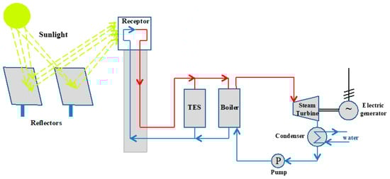 A CSP system exploits the solar thermal energy to drive a heat engine (e.g., a steam turbine, Figure 4 [65]). In this way, it is easy to couple CSP with TES, by using heat exchangers to transfer thermal energy between the heat transfer fluid used in the CSP and the storage system [66]. The fluid used in the storage system is typically a molten salt. The heat generated by the CSP that is not sent to the heat engine is then stored to be used at a later time. This fact is crucial to provide benefits by shifting the power delivery to the grid from time slots with low energy price to time slots with higher energy price. Furthermore, the presence of the TES may be an advantage to oversize the CSP system with respect to the capacity of the connecting line, storing heat each time the CSP production exceeds the capacity of the line, and releasing the stored heat to the heat engine when the CSP production becomes lower than the connecting line capacity.