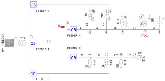 The system where measurements have been recorded is a real DN, which operates radially with an in-feeder from a transmission system at 120 kV. The single-line diagram of the system is depicted in Figure 1. The parameters of the main system components and IMs are detailed in Appendix A. As shown in the figure, the substation wye/delta transformer supplies three medium voltage (MV) feeders. Feeder 2 and sub-feeders A and B form the system analyzed in this work; see Figure 1. Feeders 1 and 3 are not detailed, because they are not relevant to this study due to the radial configuration of the system. The end-users are supplied at a low voltage (LV) level of 0.4 kV through their MV/LV Dyn 11 transformers. The MV system is grounded via a zig-zag transformer that limits the fault current to 630 A. The short circuit capacity at the 120 kV busbar is 1000 MVA.