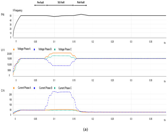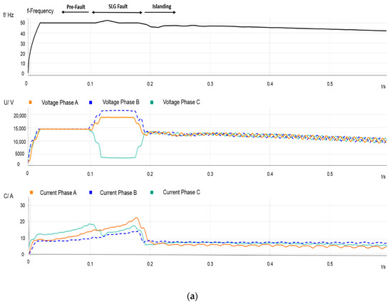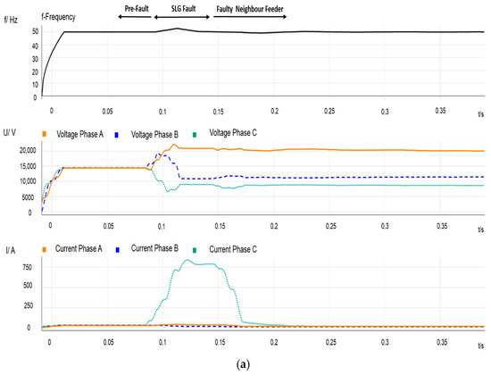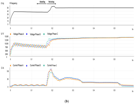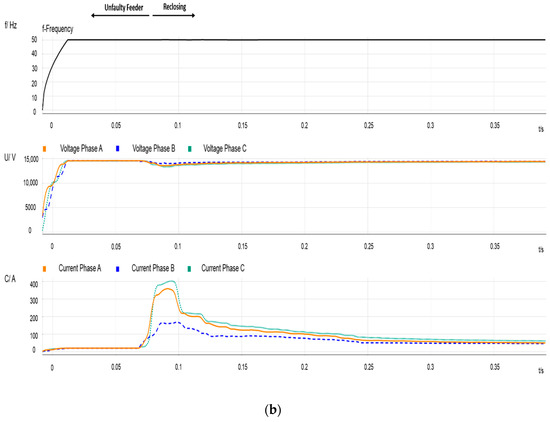 - Figure 2 depicts some recordings measured at the source side of PCC1. The two plots show frequency, voltage and current variations during a period that covers pre-fault, during-fault, and post-fault scenarios, including the post-reclosing period. The beginning of the full event is depicted in Figure 2a; the upper arrows indicate the three parts of the transient process. One can observe voltage and current variations due to CB operation: The measured currents correspond to those flowing through feeder B; the frequency is that of the transmission system and remains constant; voltages are affected by substation grounding, and they exhibit both sags and swells. Take into consideration that this can also affect the unfaulted feeder loads. Figure 2b plots the transient response caused by the reclosing operation: The current due to the re-energization, the effect of the current drawn due to the IM reacceleration, and the effect of the out-of-phase reconnection are observable.