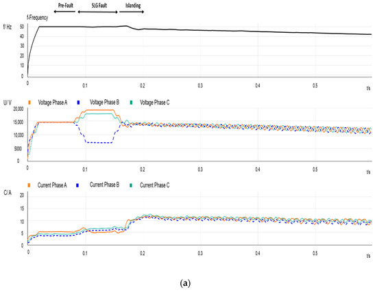 Event 2: The event corresponds to a SLG fault that occurs at a midpoint of the line between nodes 6 and 7 (L5) with a resistance fault of about 12 Ω; it is Event 4 in Table 1. Figure 4 shows measurements recorded at PCC2. It is clear from Figure 4b that the IM is acting as a generator after the circuit breaker CB clears the fault. It is also noticeable that the values when the CB recloses are lower when compared with the previous Event 1, due to the higher loads connected into the affected feeder at that instant.