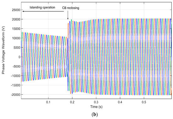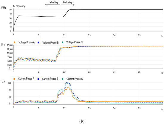 - Figure 3 depicts the measurements recorded at the MV side of the transformer at the load-side of PCC2 during the same period that Figure 2. After CB operation, the IM continues connected to the feeder, which does not longer supply active power. Consequently, the frequency in this part of the system steadily decreases until the reclosing instant. Figure 3b also shows that, according to the waveforms measured, after CB reclosing the IM reaccelerates until it recovers its rate speed, although, initially, the frequency (and the IM speed) decreases even more as a consequence of the reclosing transient; see Section 4. Take into account that frequency and voltage mismatches between the two CB terminals at the reclosing time will cause a transient torque that could seriously affect the machine.