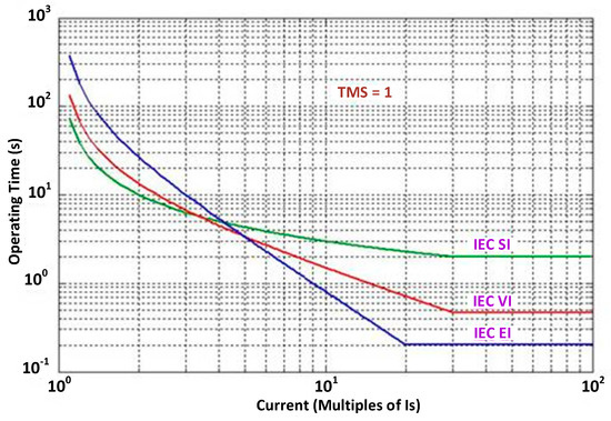 Only the characteristic curves of overcurrent relays are considered. The most common used curves are: standard inverse (SI), very inverse (VI) or extremely inverse (EI); see Figure 6. The operation time T of a 50/51 overcurrent relay can be defined by the following equation: