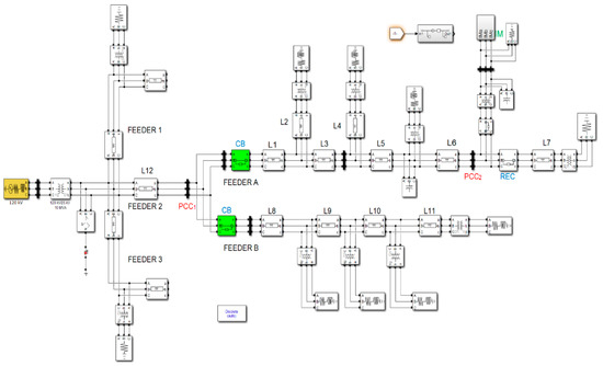 The test system model has been implemented in the MATLAB/Simulink environment using the specialized power systems toolbox library [38]. The three-phase model shown in Figure 7 has been implemented in a computer with a processor of 3.6 GHz 8-core Intel i7 and 8 GB of RAM. The simulation has been conducted in a discrete mode with a fixed sample time of 50·µs, a solver based on the Dormand-Prince eight-order (RK8) method and a simulation time for all scenarios of 2.5 s.