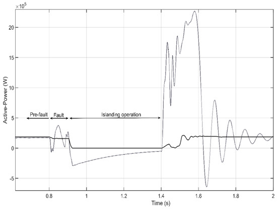 To provide more evidence that the IM is energizing the distribution network and acting as a generator, Figure 9 plots the active-power recorded at the PCC2 (see Figure 7) where the IM are connected. In this figure, it can be seen that, before the fault occurs (t = 0.8 s), the induction machine is acting as a motor (the measured active power is positive), but once the fault is cleared the power becomes negative, which demonstrates the fact that the IM is transiently acting as a generator.