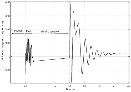 Before the fault, the electromagnetic torque of the IM acting as a motor is by convention positive. This can be observed before the fault occurs (before t = 0.8 s) in Figure 10. During the fault, the torque is not constant (between t = 0.8 s and t= 0.9 s). Once the main CB has opened (at t = 0.9 s), the dynamic torque drives the machine; its speed derivative and electromagnetic torque are both negative when acting as generator (between t = 0.9 s and t = 1.4 s). Note that the high torque that occurs once the CB recloses (t = 1.4 s) is mostly due to the out-of-phase reclosing. This reclosing transient can be more or less severe depending on the voltage amplitude and frequency difference between sources (i.e., the main grid and the IM acting as a generator).
