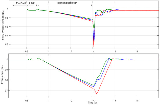 Since a deviation in the supply frequency affects the power drawn by loads, this dependence has to be considered as a frequency sensitivity [36,37]. Even though in this study, frequency deviations occur during islanding, the loads are mainly resistive, they are not affected by this frequency deviation. Although, there is not sufficient evidence (or field measurements) to select a given model, the model selected for each load provides a close enough simulation result to that obtained from measurements.