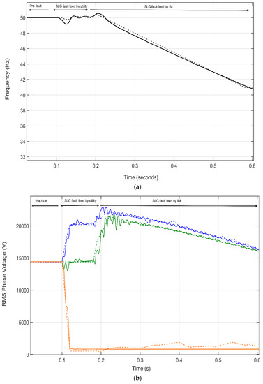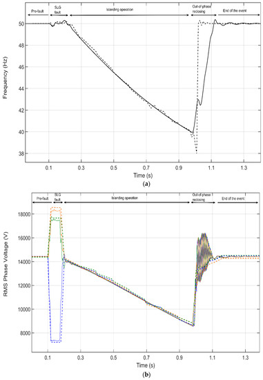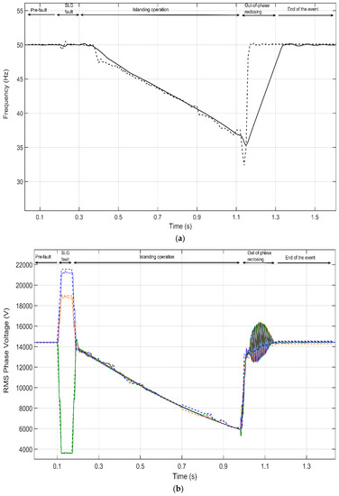 This section provides a brief overview of the islanding process prior to the model validation discussion. To emphasize the importance of this phenomenon, Figure 8 shows the simulated RMS values of the three-phase voltages of two scenarios; one scenario with IMs (solid lines) and another one replacing the IMs (dashed lines) with a static load of the same rated power. From the inspection of this figure, between the fault clearing (t = 0.9 s) and the CB reclosing (t = 1.4 s), one can observe that the IMs are energizing the isolated feeder A (See Figure 7) once its CB has opened. However, when the IMs are replaced with static loads, an interruption occurs, as expected.