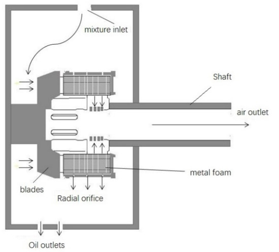 The oil/air separator, also known as the breather, is an important component of an aero-engine lubricating oil system. Its function is to separate the oil droplets from the oil and gas mixture due to the sealed bearings and then retrieve the lubricating oil. Therefore, the oil consumption is reduced with less pollution. Traditional aero-engine separators [1] use centrifugal action to achieve oil and gas separation. Due to the relatively large mass of oil droplets and the action of the centrifugal force, the oil droplets will be thrown to the wall and then recovered. However, for traditional separators, a larger radial dimension and a faster rotating speed are required in order to provide sufficient centrifugal force, which is detrimental to the weight and compactness of the engine and also increases maintenance costs.