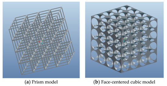 A metal foam is a complex disordered structure. It is difficult to create a geometric model of metal foam. In simulation, an orderly geometric model is usually used instead of the real disordered structure [20,21]. A geometric model should have the same porosity and PPI as the real metal foam. There are mainly three methods to simplify the metal foam. Those are the prism model [22,23], the face-centered cubic (FCC) model [24], and the body-centered cubic (BCC) model [25,26]. The prism model, shown in Figure 2a, is the simplest model and has good versatility. It can simulate almost all of the porosity in the metal foam. However, the defect is obvious. It has a wide range of straight channels in three dimensions, and as the droplets flow into the channel they are not allowed to change direction to reach the exit, which is clearly not the actual movement of oil droplets in metal foam. The FCC model, shown in Figure 2b, is formed by cutting a sphere in the center of a cube. A FCC model is geometrically similar to the prism model and has some characteristics of the prism model, such as simple modeling, but the channel is not straight. A BCC model is created by removing spheres from the center and each of the eight vertices of a cube, which is shown in Figure 3. The model has more channels and can be applied to higher porosity. A common method to generate real metal foam is to blow foaming gas into molten metal, and as the metal solidifies, the gas bubbles leave a porous material. In the process, gas bubbles can grow randomly from every direction. The BCC model assumes that bubbles grow from the center and the eight vertices of a cube, while the FCC model assumes that only one big bubble grows from the center of the cube. The BCC model more closely resembles a real metal foam structure and is, therefore, employed in this study.