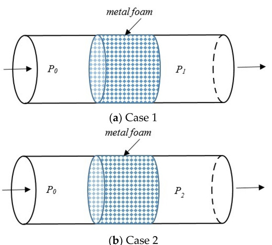 where, is the permeability, and is known as the viscous resistance factor, is the inertial resistance factor. They are two important parameters for a porous media which are unknown for a metal foam. is the viscosity of the flow, is the density of the flow, and is the velocity of the flow. In this study, these two parameters are obtained by simulations which will described below [27,28]. In actual situations, the flow is the mixture of air and oil. In previous studies, the researchers found pressure loss can be generated by liquid holdup related to the multiphase flow properties [29,30,31]. However, considering the mixture is spare multiphase flow and the droplets are much smaller than the holes in metal foam [10], only air is taken into account in the simulation. The simulation based on six assumptions [27]: