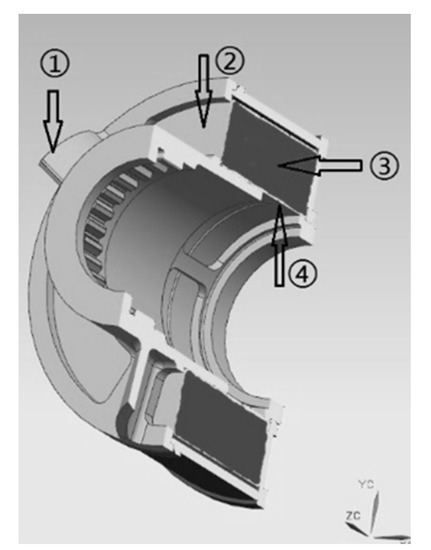 The geometry of the separator with metal foam is shown in Figure 5. The thickness of the metal foam in the axial direction is 45 mm, and the inner and outer diameters are 56 mm and 93 mm, consecutively. Figure 5 illustrates the internal structure. Part ③ was filled with metal foam. When the separator rotates, the oil-air mixture is pressed by a blade ① into the metal foam through the metal foam inlet (part ②). In the metal foam, most of the oil droplets are captured by the framework, and then the oil is scavenged through holes on the outside wall of the metal foam. The remaining oil and air are discharged through an exhaust (part ④). In this study, the aim is to investigate the pressure drop. To simplify the simulation and make the results clearer, the fluid is only air in the simulation.