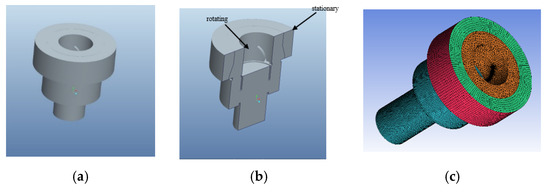 The computational domain is shown in Figure 6a,b. In order to reduce the outlet effect, the boundary of the outlet was extended by the length of the inner diameter to the downstream. Since the domain is rotating, it is difficult to determine the inlet boundary condition. In this study, a stationary domain is added around the rotating domain. The rotating domain is simulated by N–S equations with centrifugal force, and the velocity in N–S equation is relative velocity. The stationary domain is solved by the standard N–S equations, and the velocity is absolute velocity. Because the velocities are different in two domains, interface is employed between the stationary domain and the rotating domain. The metal foam is specified as a porous zone which is modeled by the addition of a momentum source term composed of a viscous loss term and inertial loss term. Other no-porous parts are solved by N–S equations with no loss term of momentum source. There is not interface between the porous part and the neighboring non-porous parts.