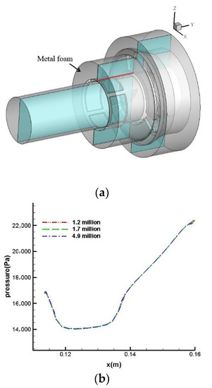 A mixed grid scheme is used, as displayed in Figure 6c. Tetrahedral mesh is applied in the orange domain, and hexahedral mesh is adopted in other domains. The grids around the wall are dense with a dimensionless wall distance y+ of about 5, which is necessary to capture the near-wall turbulent region and be mesh independent. The total grid number is approximately 1.2 million. Pressure on the inner wall of metal foam is checked to investigate the grid dependence. The location is on the red line in Figure 7a. Pressure on three different sets of meshes is shown in Figure 7b. It appears that the numerical solution with smaller cells will not change significantly.