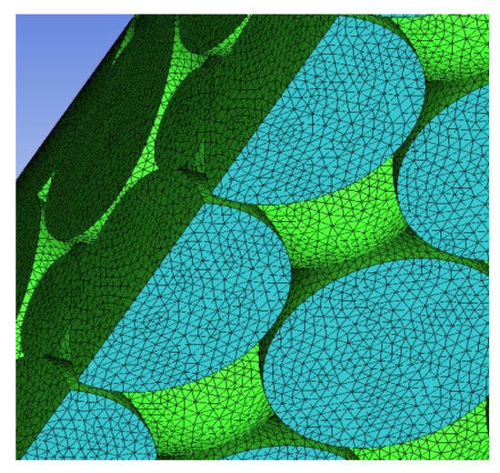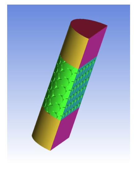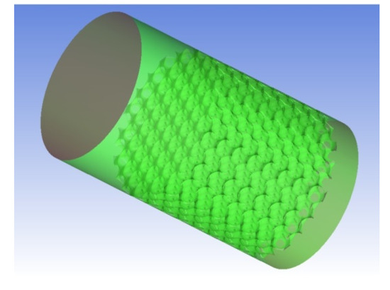 A metal foam with 88% porosity and 45 PPI [17] was selected to validate the simulation method of metal foam. Firstly, the BCC model was used to rebuild the tiny holes and framework in metal foam. A pipe with metal foam was shown in Figure 8. Since there is a huge number of grids to describe small holes in metal foam, half of the pipe was selected as a computational domain, which was shown in Figure 9. The details of the grids are shown in Figure 10. The grid number was about 6.9 million. Sixteen conditions were simulated as inlet velocity ranges from 0.5 m/s to 2 m/s with intervals of 0.1 m/s. The range of normal inflow Reynolds number is Re < 5.04 × 104, which concludes that for metal foam in separator, Re < 4.01 × 104. With the simulation results, viscous resistance coefficients and inertial resistance coefficients are computed according to Equations (11) and (12). After fitting, viscous resistance coefficient and inertial resistance coefficient are 3.36 × 108 (1/m2) and 1.32 × 104 (1/m) separately.