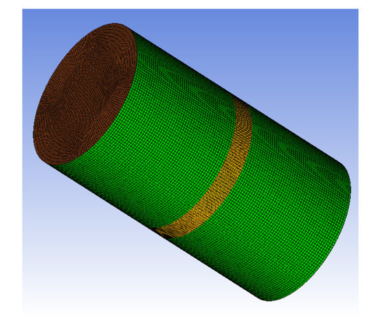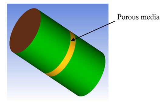 Secondly, the metal foam was treated as porous media in the pipe simulation. A pipe with 140 mm diameter, which is accordance with literature [17], was selected to simulate the pressure drop. The length of the pipe is 260 mm. As shown in Figure 11, the yellow region in the middle of the pipe is the porous media with the resistance coefficient 3.3589 × 108 (1/m2) and inertial resistance coefficient 1.3182 × 104 (1/m). A hexahedral mesh was used, shown in Figure 12, and the number of grids was about 0.4 million.