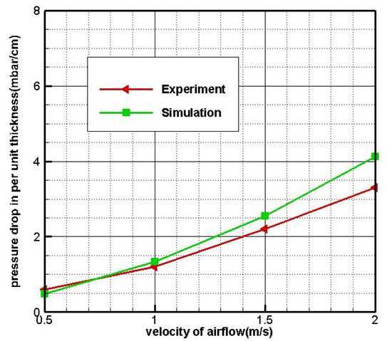 Figure 14 is the comparison of the pressure drop in per unit thickness between simulation and experiment [17]. In [17], the foam material is a Ni-based superalloy and produced in sheets. The pressure drop in per unit length was measured as a function of velocity from 0–3 m/s. The result shows that high velocity gives rise to large pressure drop in per unit length. In Figure 14, the simulated result shows the higher the inlet velocity, the larger the pressure loss, which is in fairly good agreement with experimental data. Therefore, comparison indicates that this method can be used to simulate a metal foam.