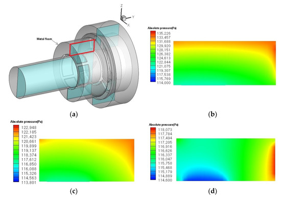 Pressure distribution of a cross section of metal foam. (a) cross section; (b) 36,000 rpm; (c) 18,300 rpm; (d) 0 rpm.