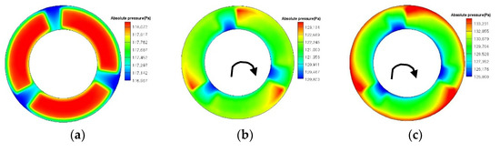 Pressure distribution of the inlet of metal foam. (a) 0 rpm; (b) 18,300 rpm; (c) 36,000 rpm.