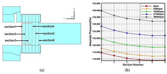 Thirdly, the change in pressure drop along the axial direction was analyzed. In order to analyze the pressure drop in metal foam, six section planes were created along the axial direction, as shown in Figure 17a. Figure 17b shows the average pressure on each section plane with different rotating speeds. Pressure decreases along the axial direction in the metal foam. The downward trend of pressure is relatively flat at all rotating speeds. As the rotating speed increases, the pressure in the metal foam also increases. Although the rotating speed increases at the same growth interval which is about 9000 rpm, the pressure increase becomes greater. This indicates rotating speed has a very important effect on pressure drop.