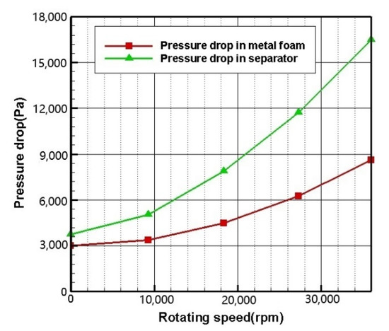 Fourthly, the comparison of the pressure drop in the separator and the metal foam is discussed. Figure 18 shows the pressure drop changes with different rotation speeds in the separator and the metal foam. It can be seen that increasing the rotating speed leads to an increase in the pressure drop of the metal foam. However, as the rotating speeds increase, the difference becomes larger between the metal foam’s pressure drop and separator’s pressure drop. When the rotating speed is 9300 rpm, the ratio of the pressure drop in metal foam to that in the separator is 67.1%. However, when the rotating speed is 36,000 rpm, the ratio decreases to 52.2%. This indicates that when the rotating speed is high, rotation is a main cause of the pressure drop and the pressure drop of the metal foam becomes smaller.