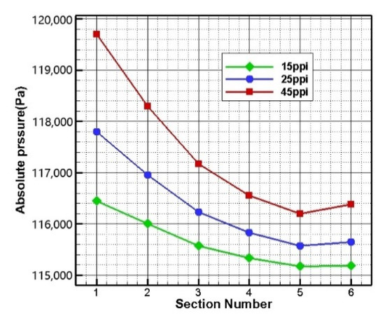 In this section, the effect of different PPI on pressure drop is discussed. The working conditions are as follows: mass flow rate is 30 g/s, rotating speed is 0 rpm, porosity is 92%, and pore density is 15 PPI, 25 PPI and 45 PPI.