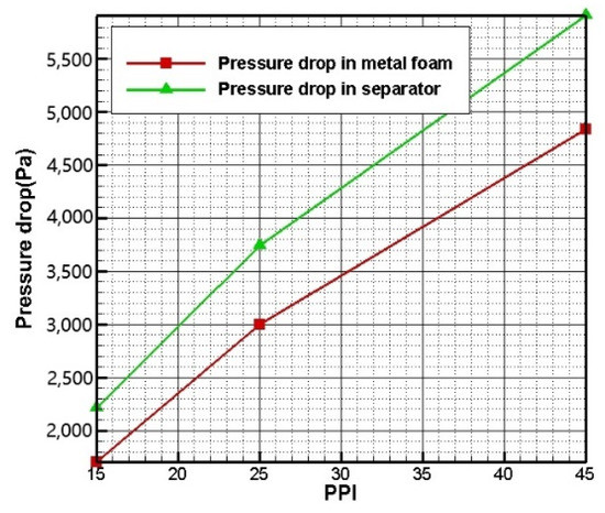 Figure 19 shows pressure changing in the metal foam along the axial direction with different PPI. It can be seen that the pressure decreases in the metal foam along the axial direction. With smaller PPI, the pressure goes down more gradually. This is because smaller PPI means fewer pores in the same length of metal foam, which gives rise to smaller flow resistance. With the increase of PPI, the pressure change in the metal foam is very steep. In section plane 1 in particular, the pressure is very high. This means that the air flowing into the metal foam requires a higher pressure. In Figure 20, pressure drops are displayed in the metal foam and the separator. It can be seen that the pressure drop caused by the metal foam is a main factor in the pressure drop of the separator. When PPI is 15, the ratio of pressure loss in metal foam to that in the separator is 76.8%, while when the PPI is 45, the ratio becomes 81.8%. This indicates that metal foams with higher PPI have a greater effect on the pressure drop of the separator. From Figure 20, it can also be seen that the trends of pressure drop in the separator and in the metal foam with different PPI are approximately linear. It shows that a high PPI corresponds to a large pressure drop. The greater the PPI, the larger the pressure drop.