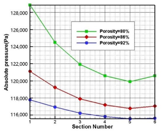 Pressure changing in the metal foam along the axial direction with different porosity.