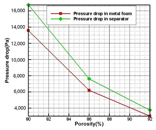 Porosity of the metal foam also affects the pressure drop. The working conditions are air flow rate of 30 g/s, rotating speed of 0 rpm, PPI of 25 and porosity of 80%, 86%, 92%. The pressure drops with different porosity are displayed in Figure 21. High porosity means less framework, more and bigger pores. As a result, the flow resistance and the pressure drop are small. Therefore, in Figure 21 it can be seen that the pressure in the metal foam with porosity of 92% changes more gradually, while the pressure in the metal foam with porosity of 80% changes sharply. For a porosity of 80%, the metal foam has a larger framework, which increases the flow resistance, so the inflow requires a larger pressure. In Figure 21, the porosity is decreasing at intervals of 6%, but the pressure increases in the metal foam inlet is not equal. From porosity of 92% to 86%, the metal foam inlet pressure increases 3323 Pa, while from porosity of 86% to 80%, the pressure increases 7739 Pa. This indicates that with lower porosity, much higher pressure is needed. Figure 22 displays the pressure drop changes with different porosity in metal foam and separator. It can be seen that lower porosity has a greater effect on pressure drop. As the porosity decreases, the pressure drop increases rapidly both in the metal foam and separator. However, as the porosity is 92%, 86%, 80%, the ratio of pressure loss in the metal foam to that in the separator is very close, about 81%. This indicates that metal foams with different porosity have no much effect on the ratio of the pressure drop in the metal foam to that in the separator.