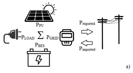 The scheme of a typical grid-connected hybrid photovoltaic-battery system, suitable for residential and commercial applications, is depicted in Figure 2a; the photovoltaic generator, the storage system, the aggregated load, and the meter are shown along with their respective profiles: PPV, PLOAD, PBES, and PGRID. For the latter, it is appropriate to distinguish between the power flow from the system to the grid, Pexported, and power flow to the system, Pimported; such a distinction is necessary for the calculation of the electricity bill, the net-metering, etc. In practice, the realization of a hybrid photovoltaic-battery system requires, first selecting the system configuration, by choosing between the two system configurations illustrated in Figure 2b,c. The configuration in Figure 2b is typical for new installations where both the generator and the storage are brand new and installed at the same time. The power converter A is a dc-dc converter that ensures the tracking of the maximum power point of the photovoltaic generator, the power converter B is a current-controlled dc-ac converter that injects an AC current that, in most of applications, is in phase with the voltage detected at the output terminals. The power converter C is a dc-dc converter which regulates both the charge and discharge of the batteries. It is a step-up or step-down type, depending on preferences and choices during design, including the number of cells of batteries that realize the storage system. All these power electronic converters, A, B and C, are interconnected with each other by means of a centralized controller, which acquires information and measurements in order to optimize the operation of the hybrid system as a whole. The small number of converters makes the use of a single microcontroller possible for executing all the measurements and calculations, including the generation of pulse-width modulation signals for the switches of all the converters. The configuration, illustrated in Figure 2c, refers to the so-called retrofit of an existing system, where the photovoltaic generator has already been installed on the rooftop, before and, in a second step, a new storage system is installed. When retrofitting, the power electronic converters A, B, and C rarely communicate or cooperate with each other, they are not coordinated by a central controller. Sharing a voltage or current measurement can be very difficult, even when these converters adopt an international communication standard, such as the IEC61850.