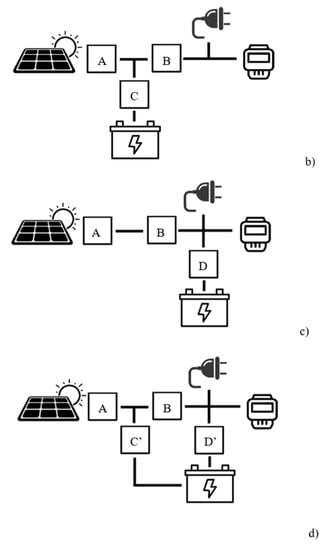 The configuration of Figure 2d is less known and less widespread than the previous two configurations. It is more expensive but also advantageous in case of a weak distribution grid, when the hybrid system is often forced to operate in islanded mode []. Supposing a blackout or an excessive deviation of the amplitude or frequency of the voltage at the point of common coupling, the relay that connects the hybrid system to the grid opens; the converter D’ performs a seamless transition from grid-connected to islanded mode as to ensure in the local grid of the hybrid system a stable voltage, close to the reference values [,]. When islanded, the current-controlled converter, B, continues to operate without interruption as the converter D’ compensates for over generation and under generation. Since a failure of the converter B determines the disconnection of the unique power generator inside the hybrid system and the total collapse of the system itself, the additional converter C’ provides a solution; it increases the cost of the hybrid system, as well as the robustness, since it allows the storage system to be recharged by the photovoltaic generator and, in turn, offers the load to be supplied by the batteries. The two converters C’ and D’ do not necessarily have the same rated power.